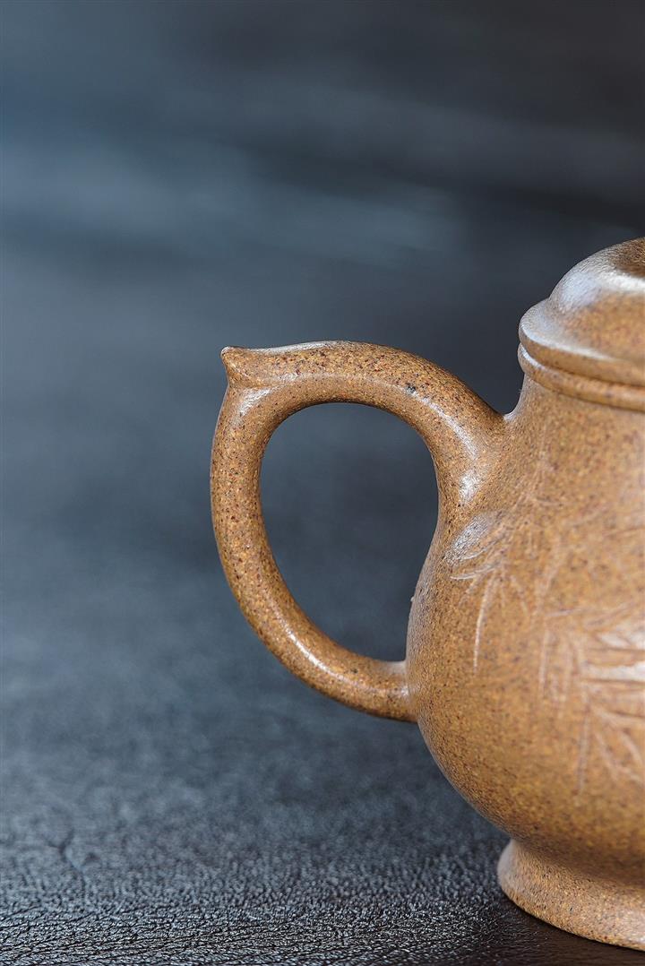 它也融合了掇球與仿古的特點,其壺身上縮下豐,壺肚圓潤,壹派雍容氣象。壺鈕如同壹座拱橋,使壺體更添壹抹舒展挺拔、端莊穩重之感。