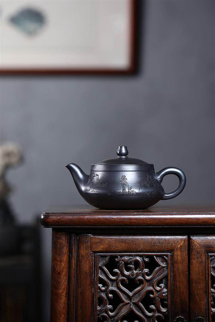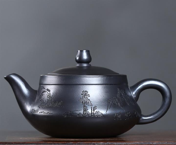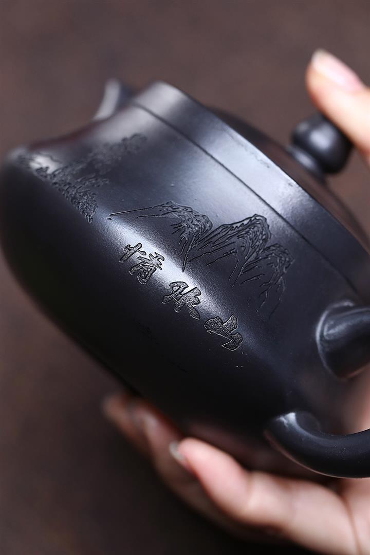 原礦石黃刻繪山水曲茶壺POT7543