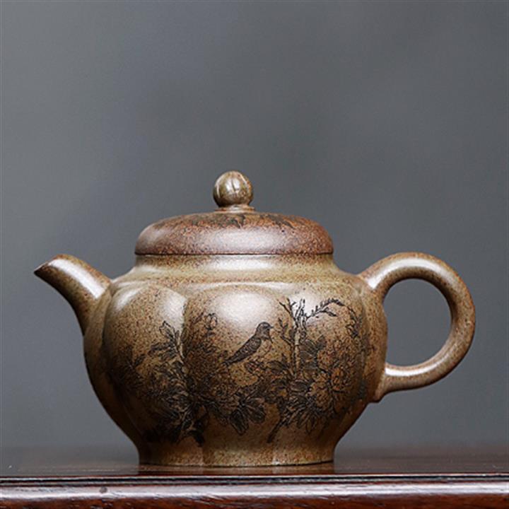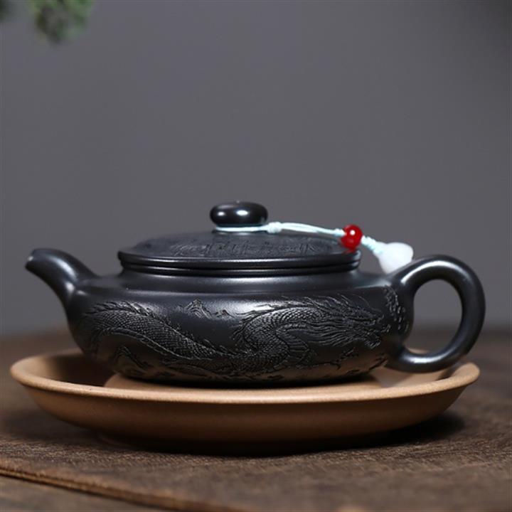 原礦石黃泥龍紋扁腹滿刻茶壺POT7723