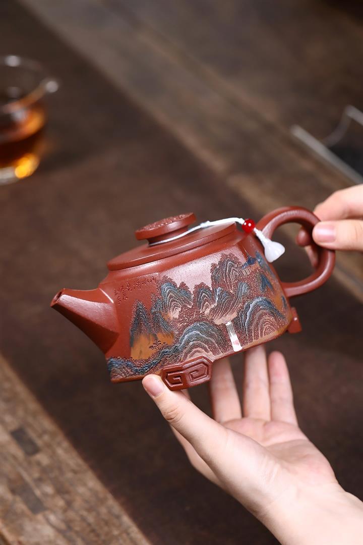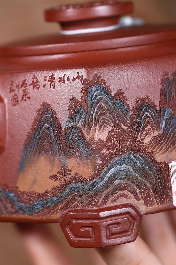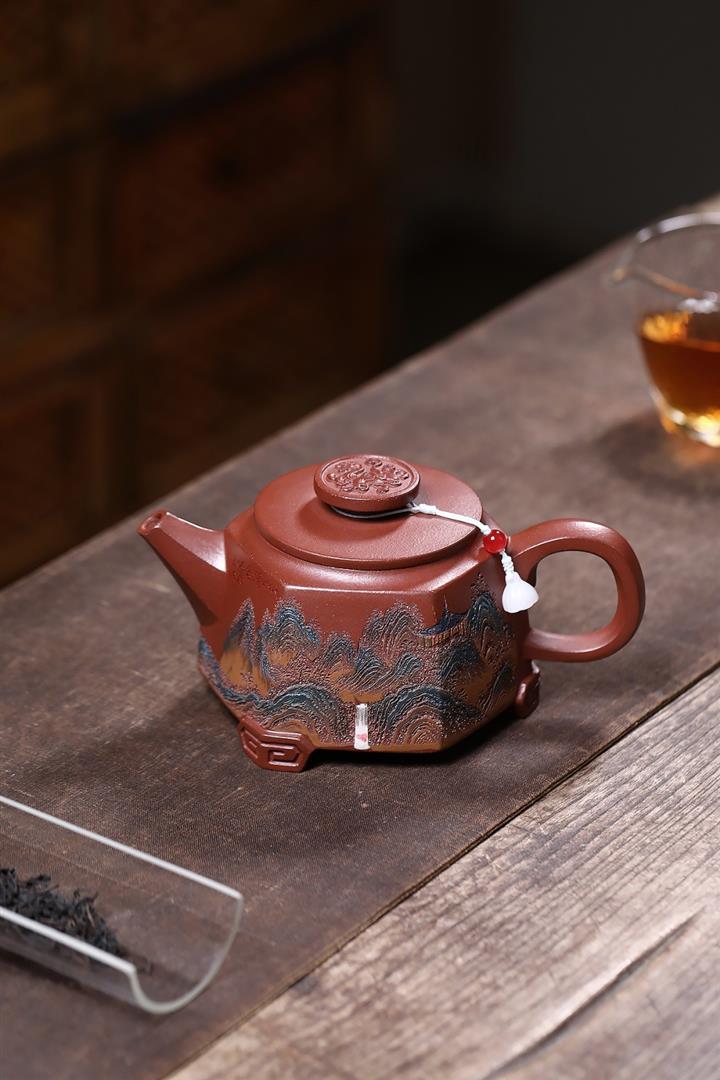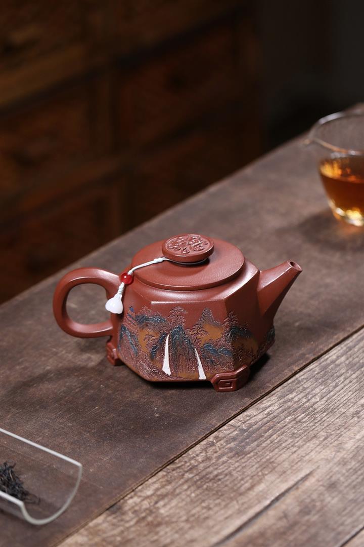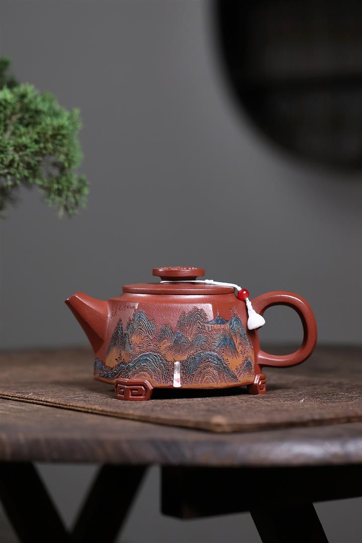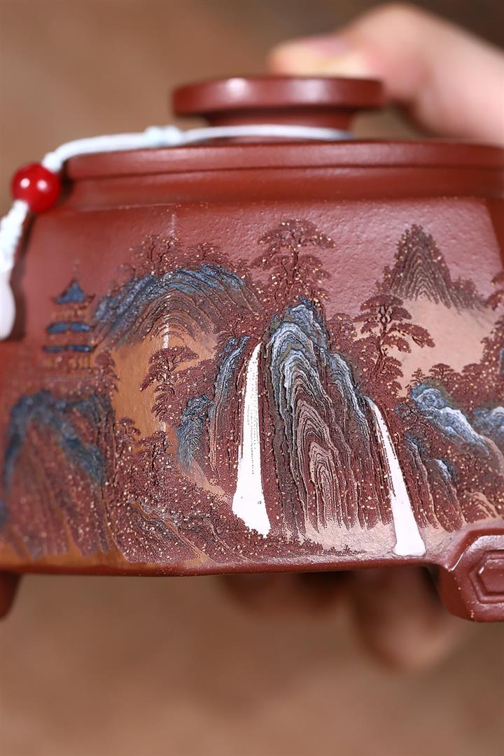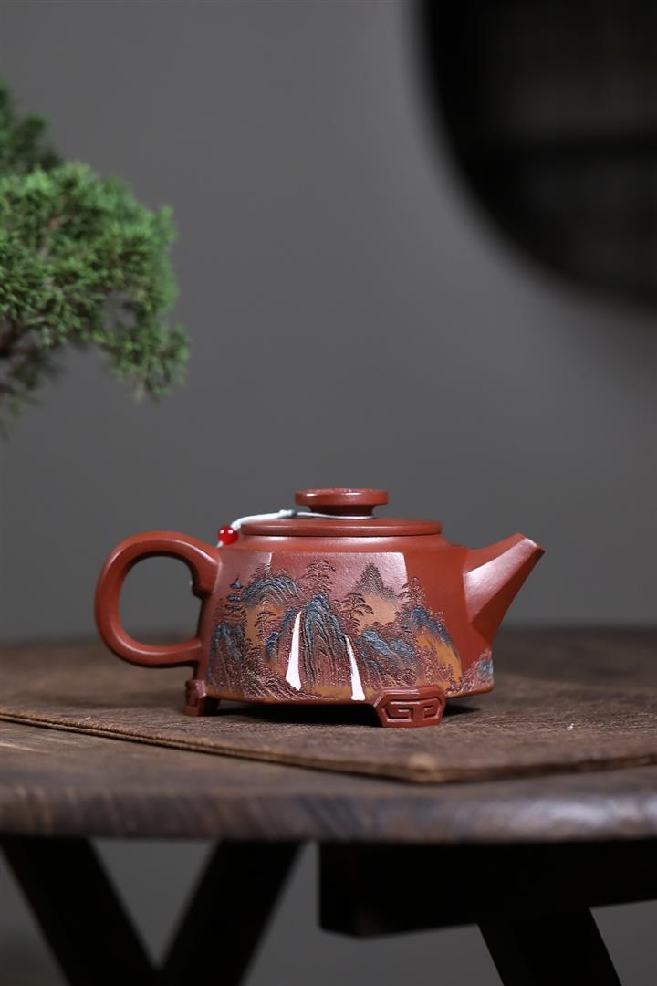 原礦紅降坡彩繪山水三足鼎立茶壺POT7805