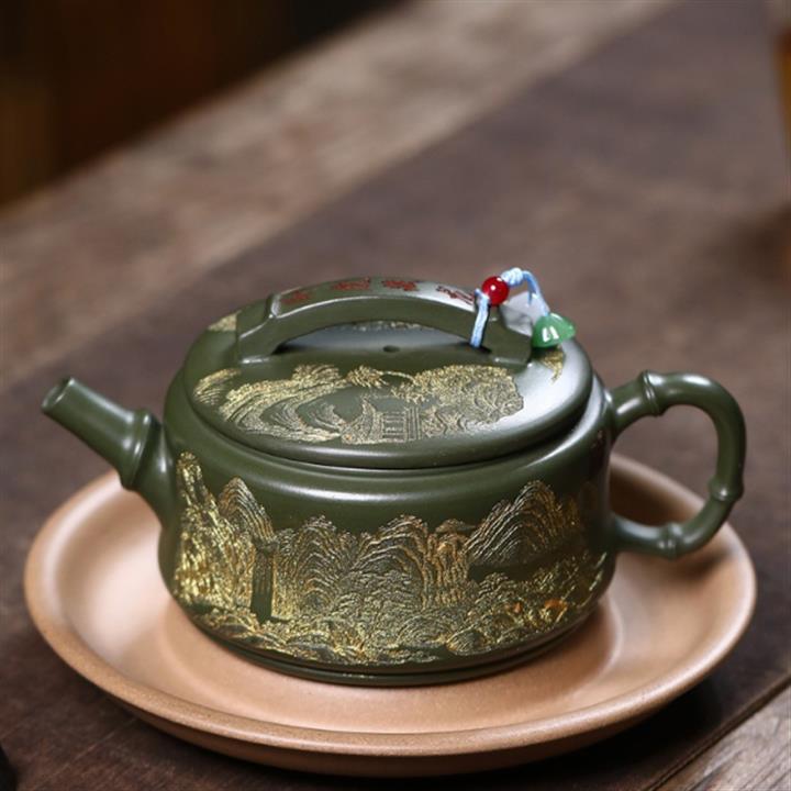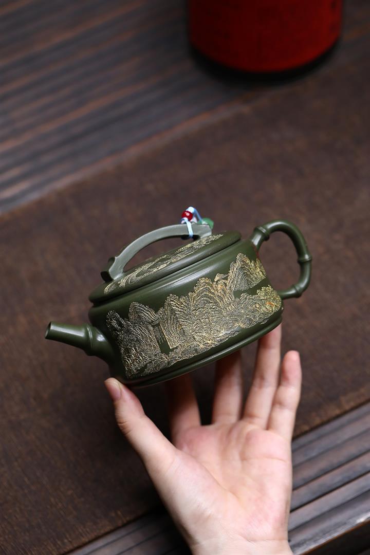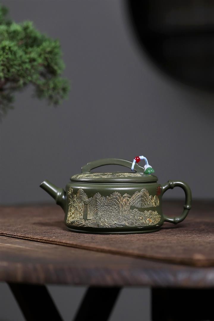 原礦綠泥滿刻三羊開胎茶壺POT7846