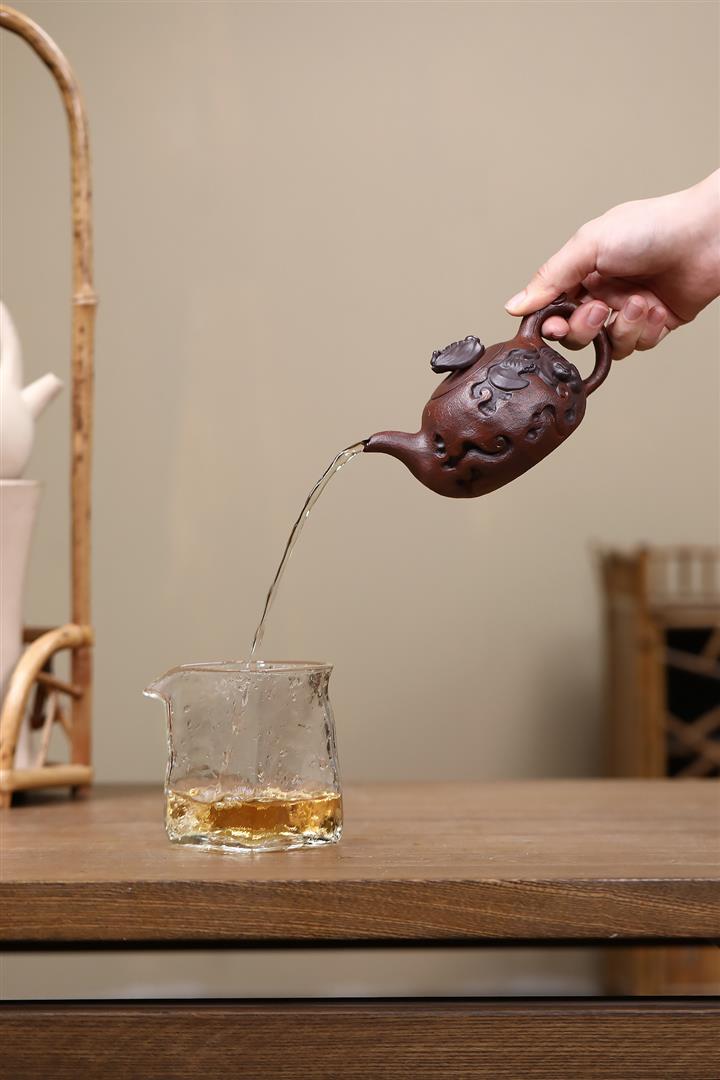 【泥料特點】砂土氣重,似淳實農民,日久使用,漸露鋒芒,養成變化,溫潤莊重。紫砂是壹種雙重氣孔結構的多孔性材質,氣孔微細,密度高。用紫砂壺沏茶,不失原味,且香不渙散,得茶之真香真味。紫砂使用越久,壺身色澤越發光亮照人,氣韻溫雅。紫砂壺長久使用器身會因撫摸擦拭,變得越發溫潤光澤。