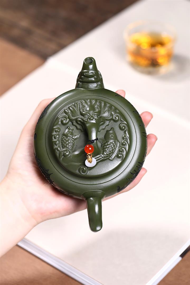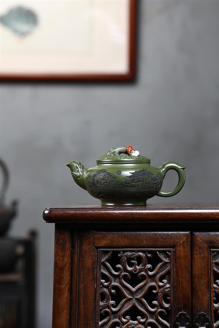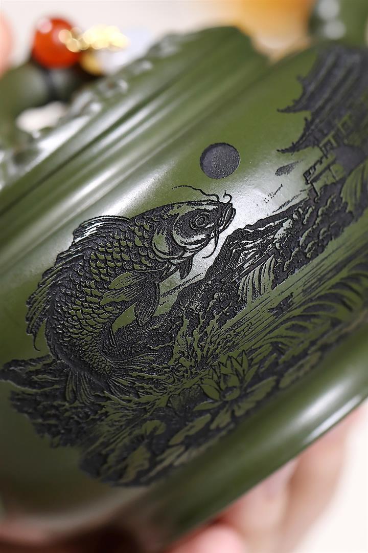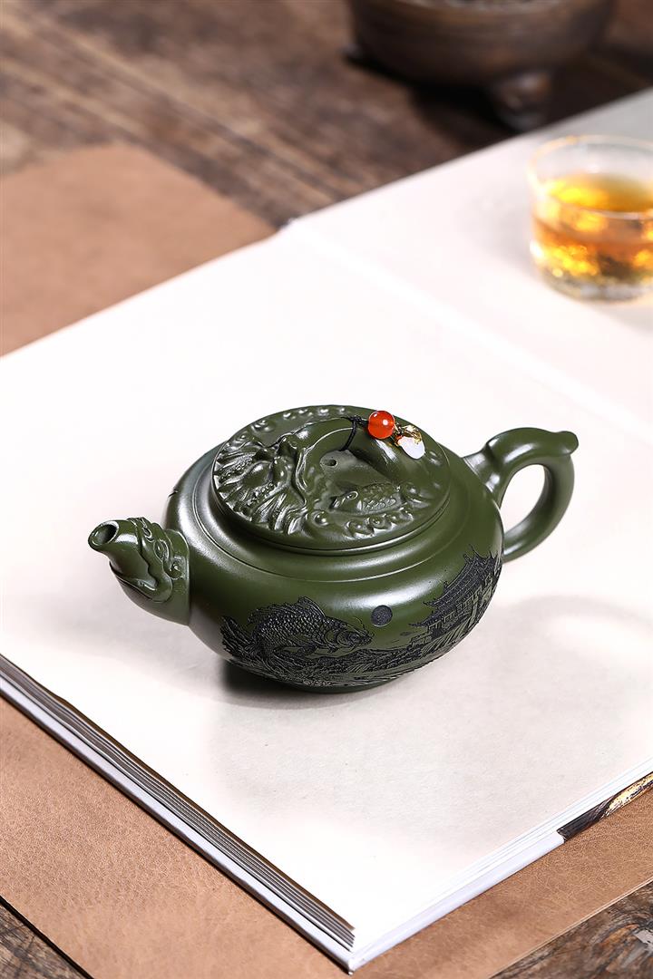 原礦綠泥浮雕魚躍龍門泡茶壺POT7901
