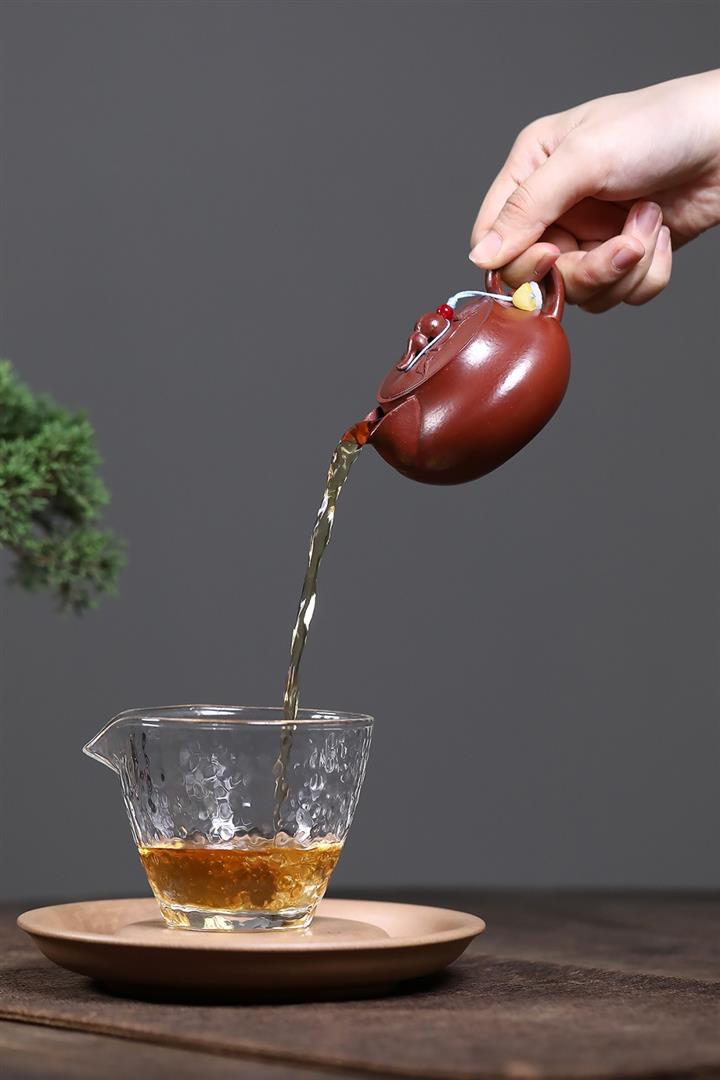【泥料特點】砂土氣重,似淳實農民,日久使用,漸露鋒芒,養成變化,溫潤莊重。紫砂是壹種雙重氣孔結構的多孔性材質,氣孔微細,密度高。用紫砂壺沏茶,不失原味,且香不渙散,得茶之真香真味。紫砂使用越久,壺身色澤越發光亮照人,氣韻溫雅。紫砂壺長久使用器身會因撫摸擦拭,變得越發溫潤光澤。