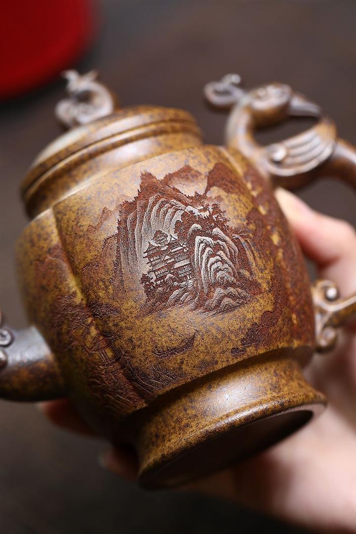 原礦石黃泥龍紋扁腹滿刻茶壺POT7723
