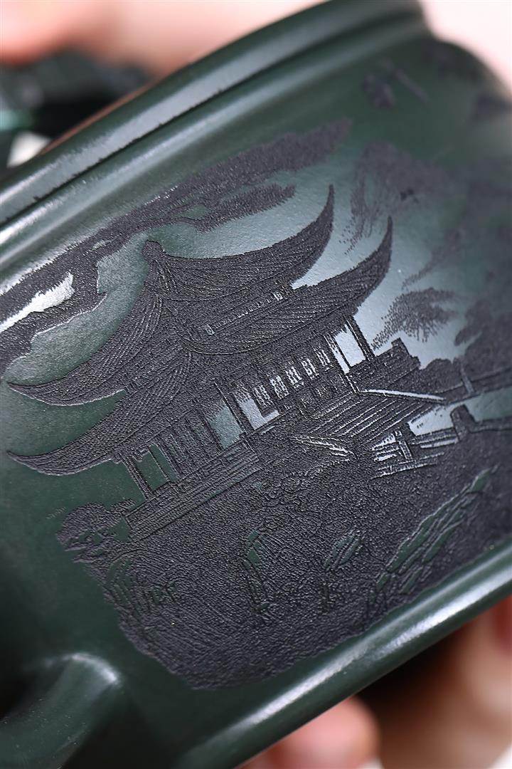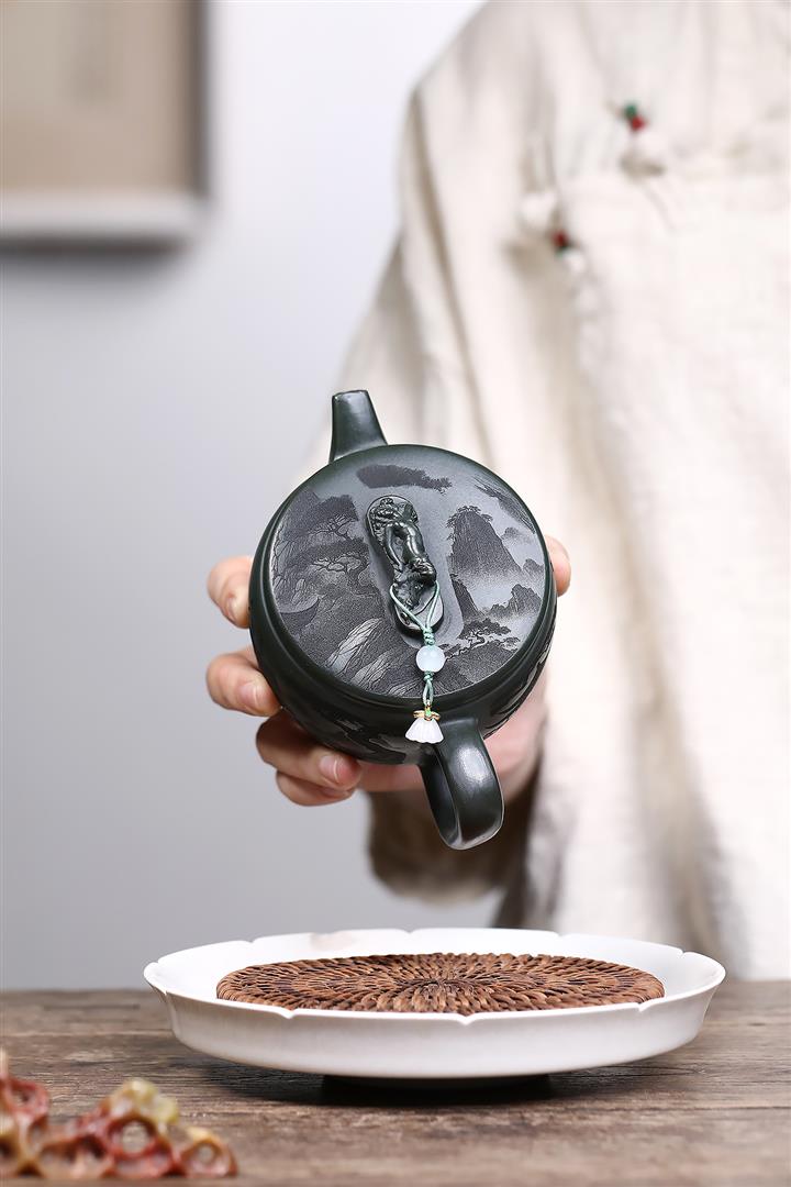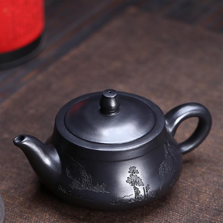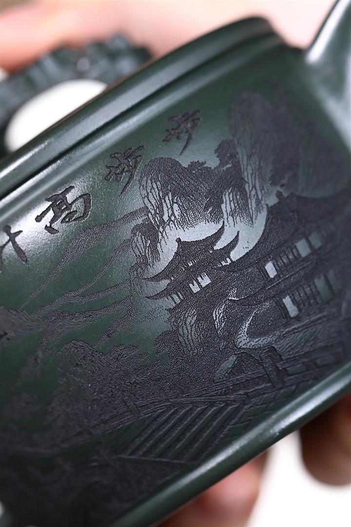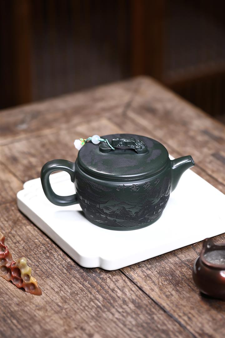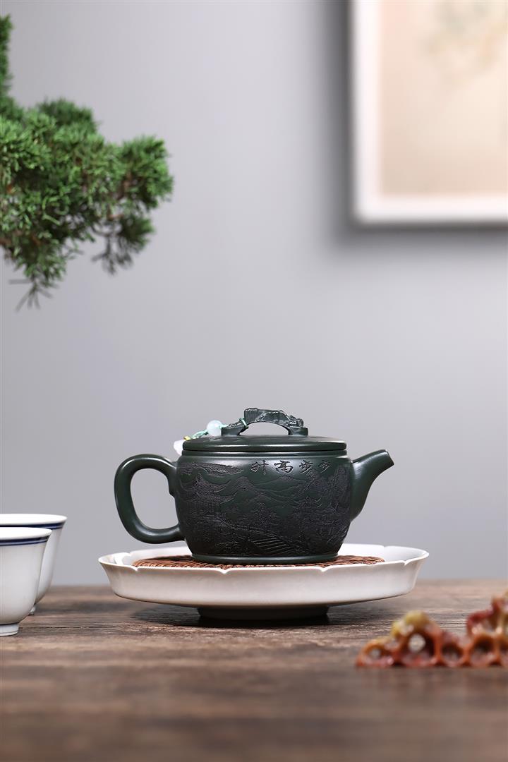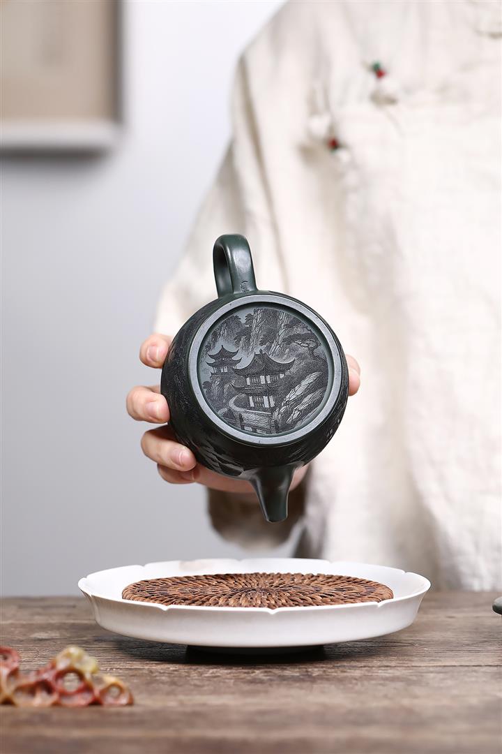 原礦石黃刻繪山水曲壺茶壺POT7683