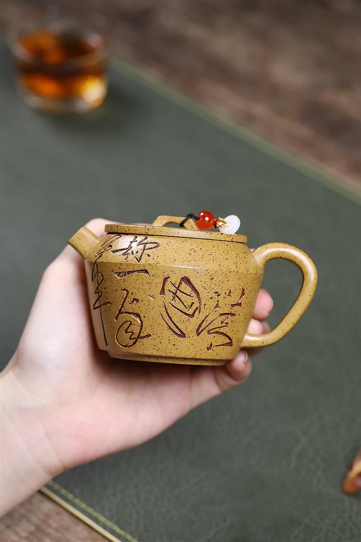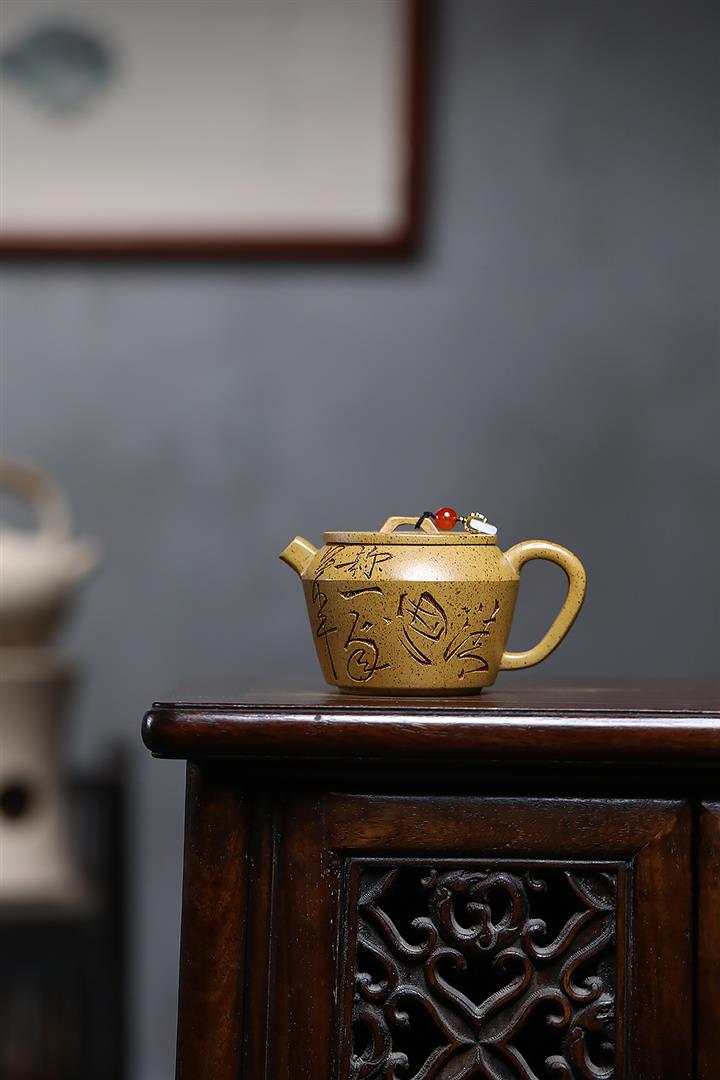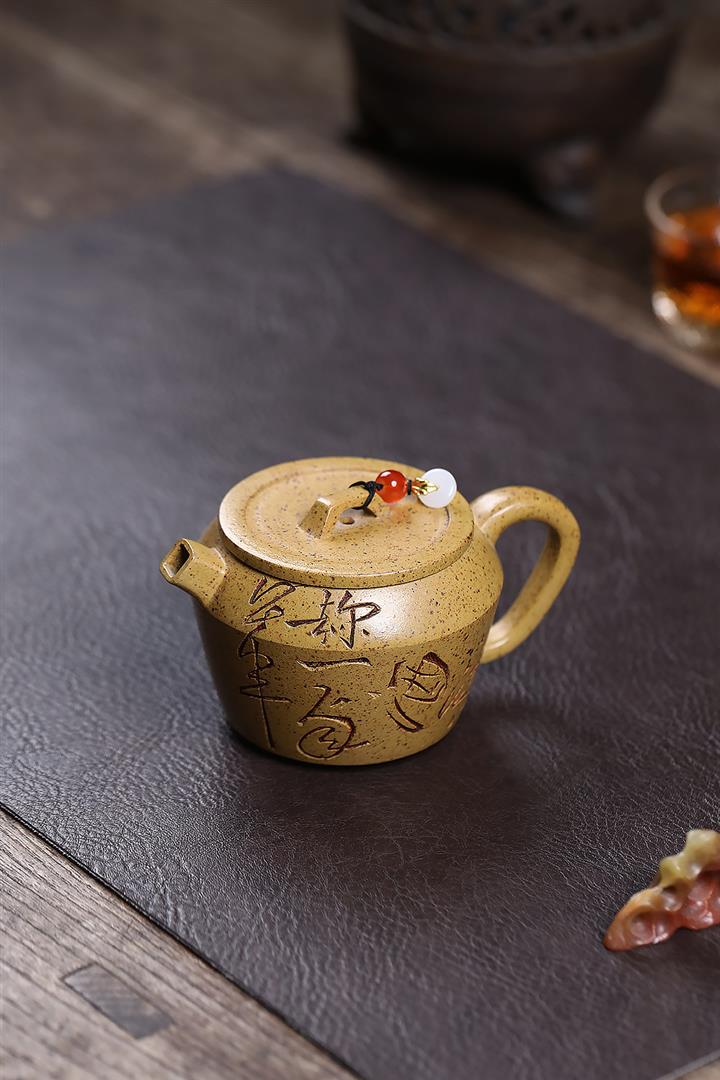 原礦石黃刻繪山水曲壺茶壺POT7683