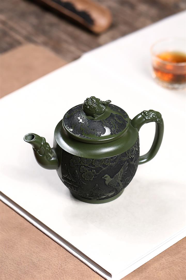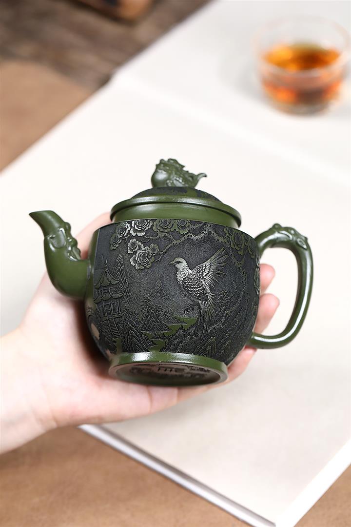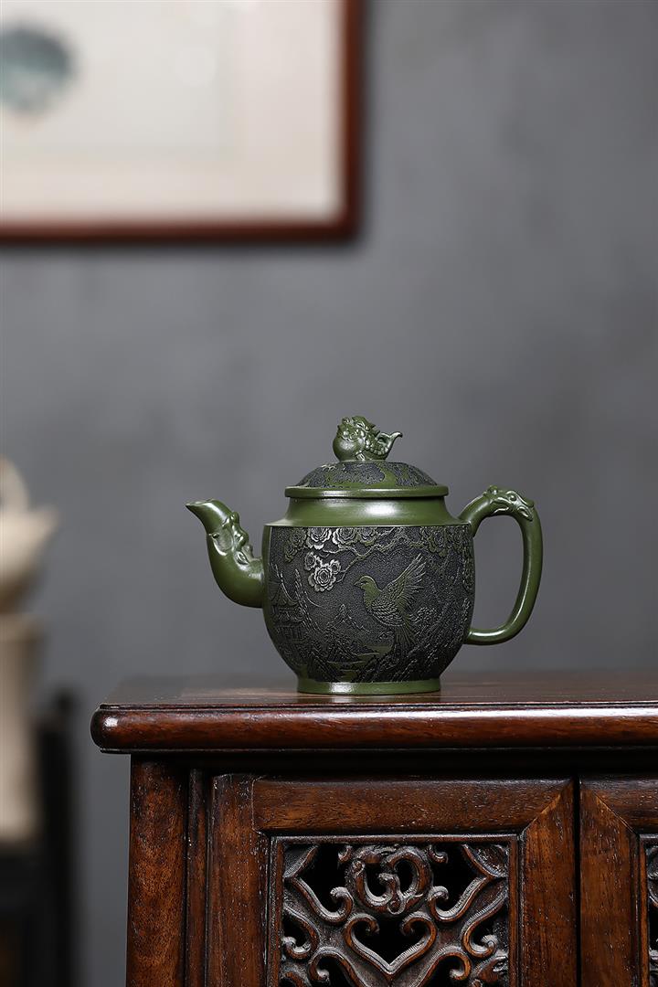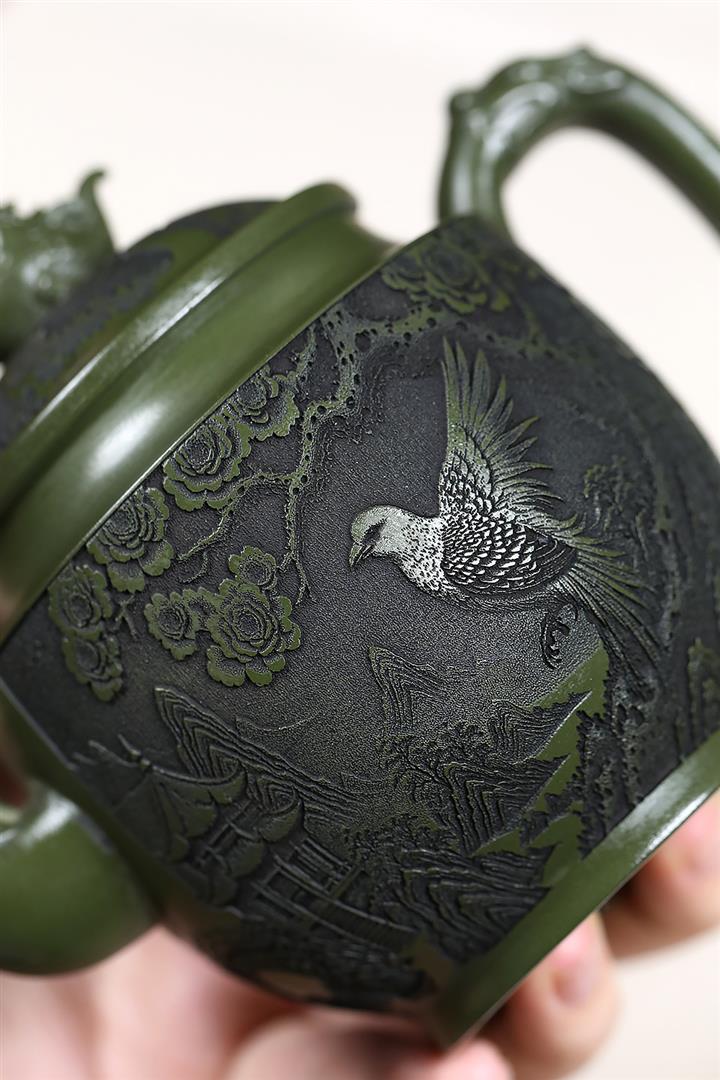 原礦綠泥刻繪花鳥宮燈茶壺POT7623