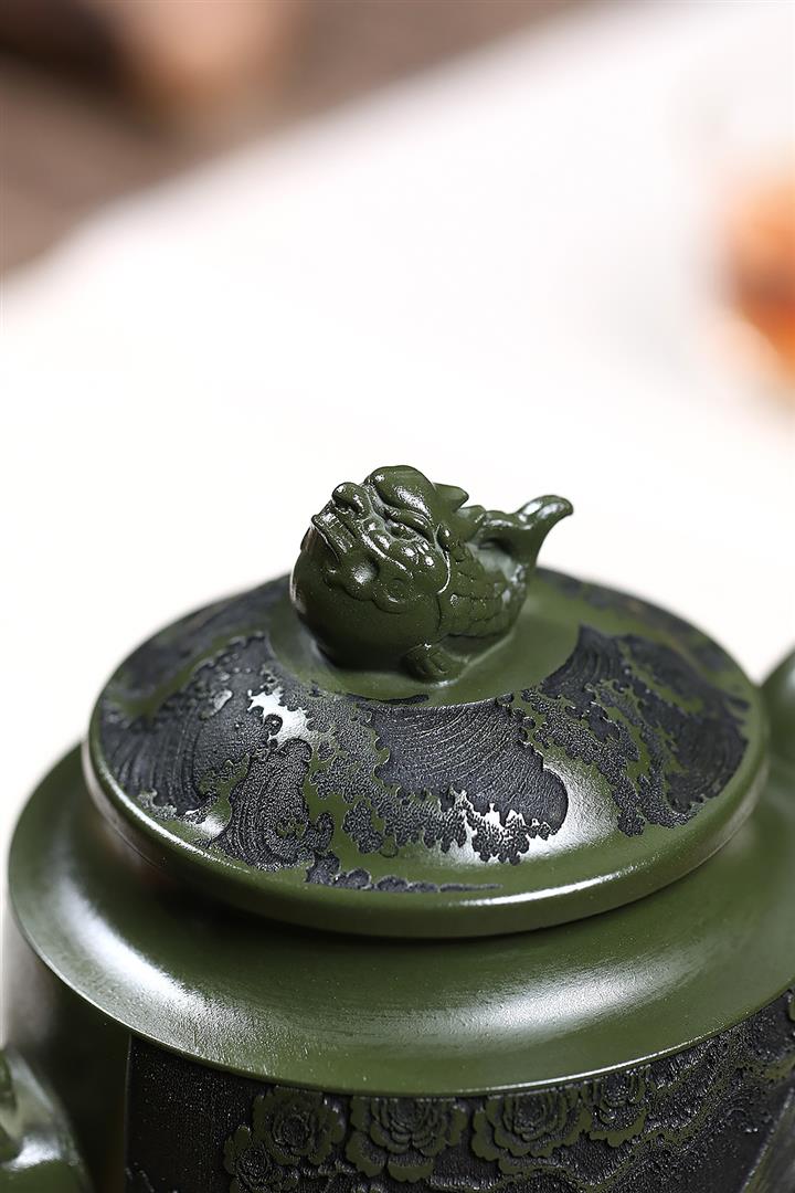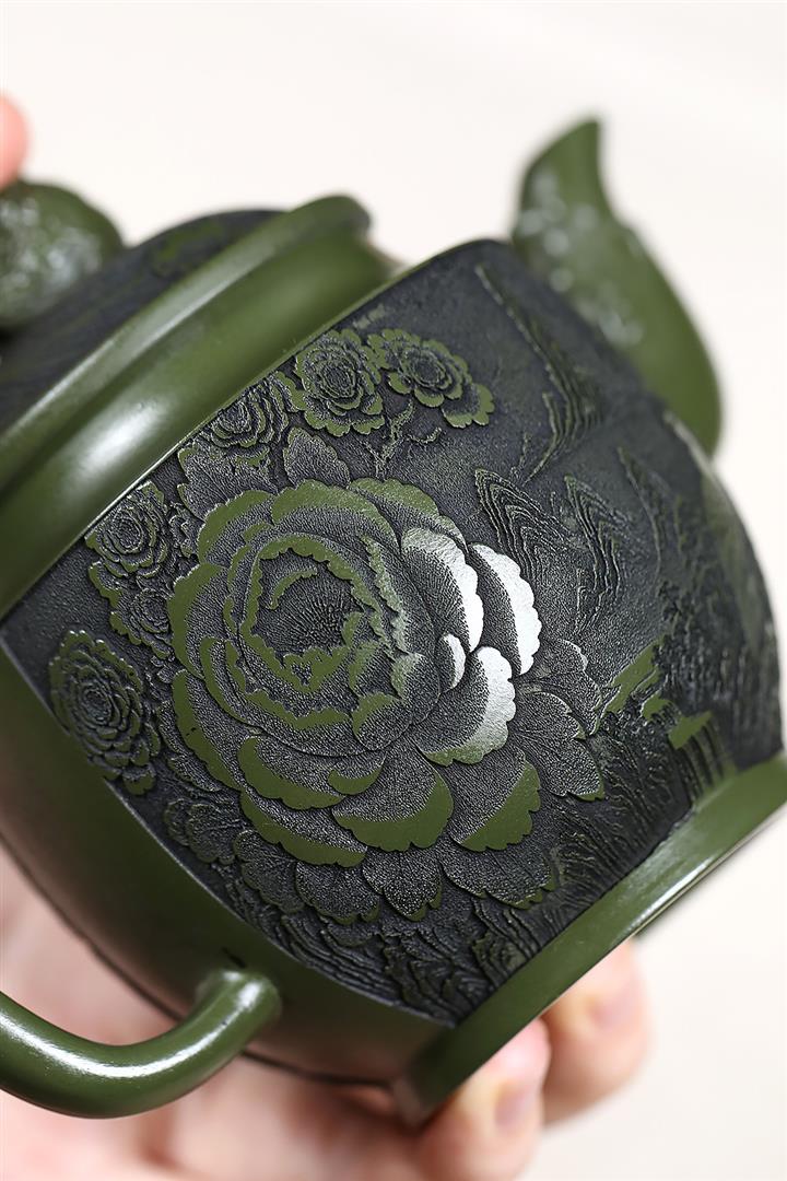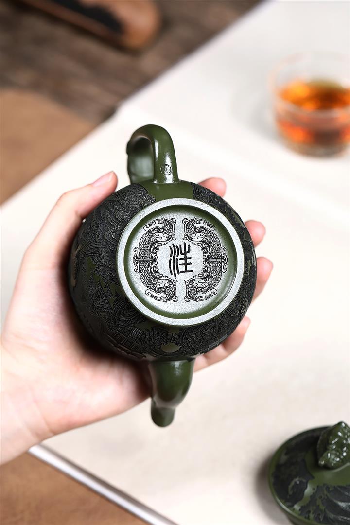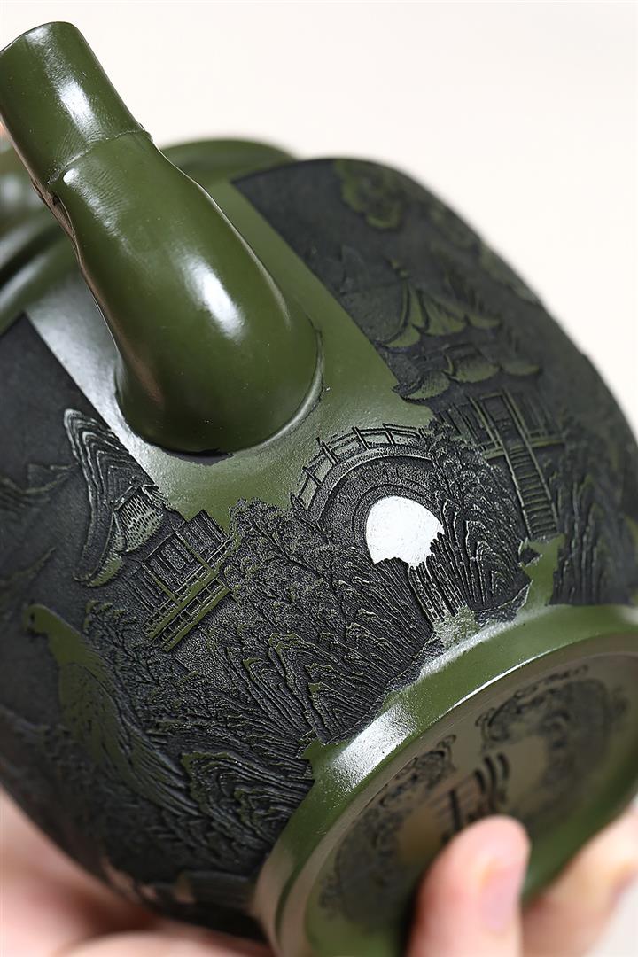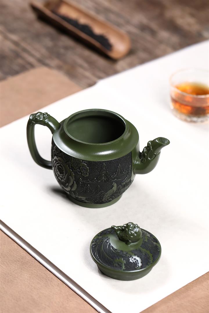 原礦綠泥刻繪花鳥宮燈茶壺POT7623