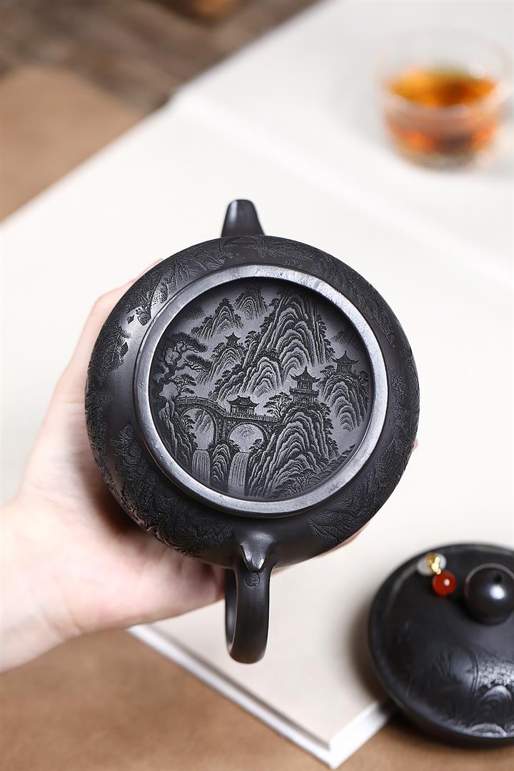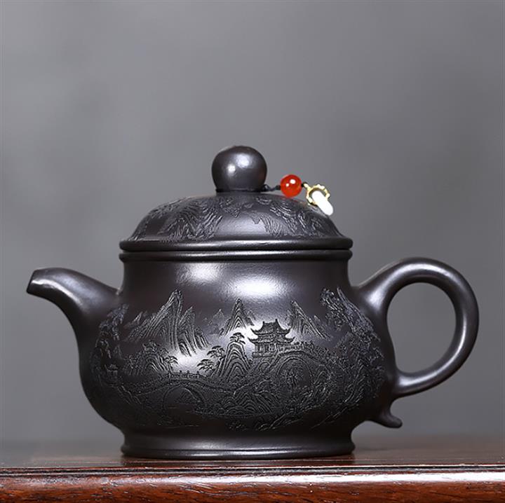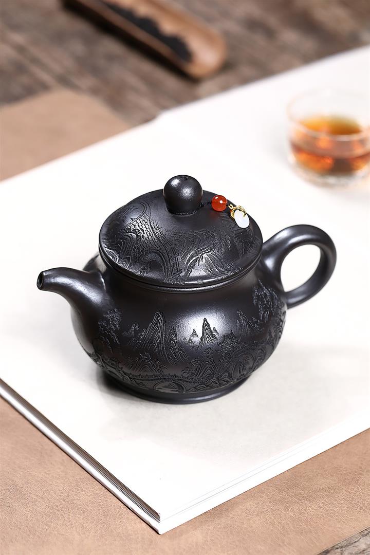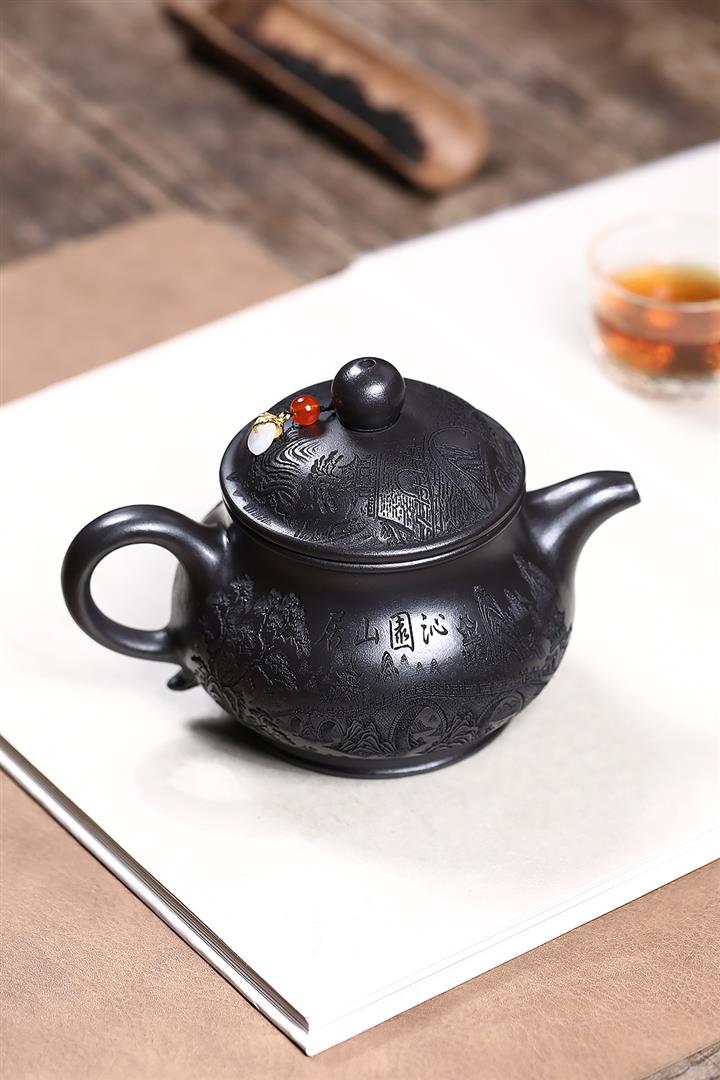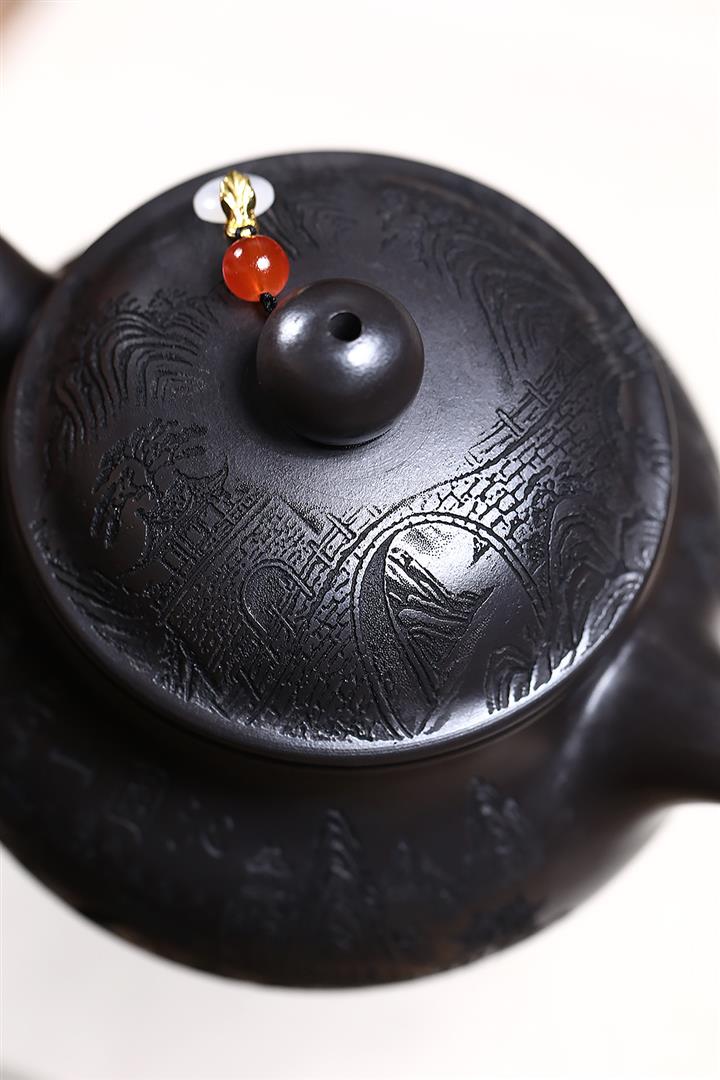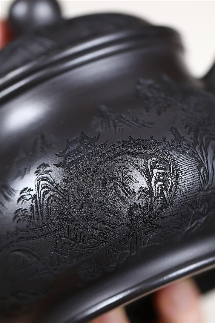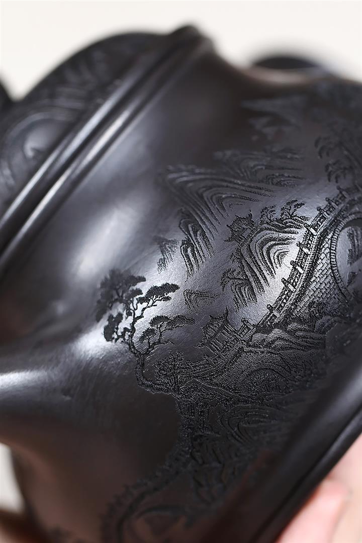 原礦玄鐵石黃刻繪覓香苑曲壺POT7592