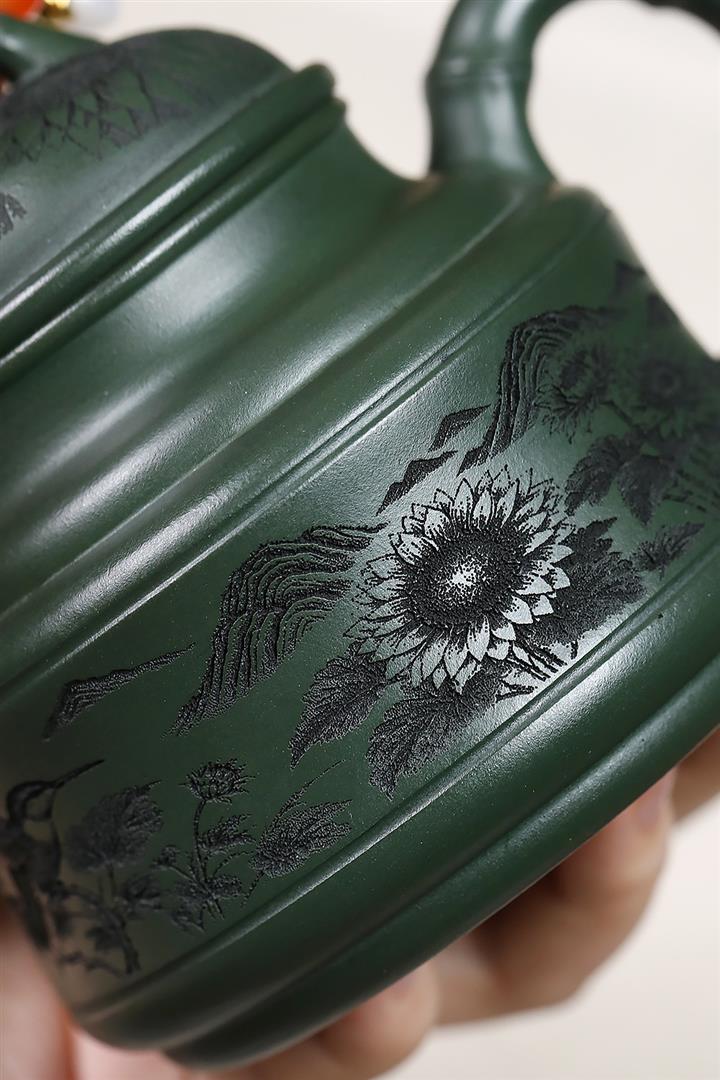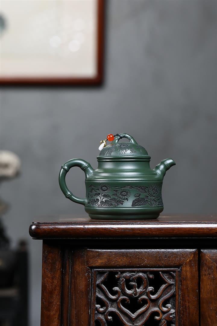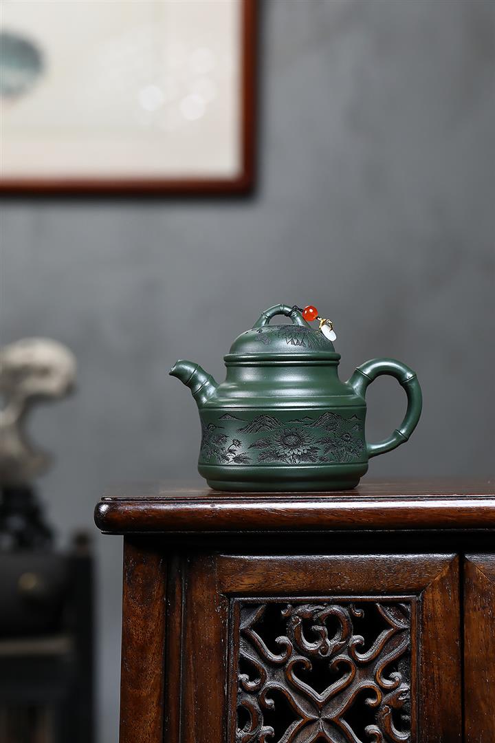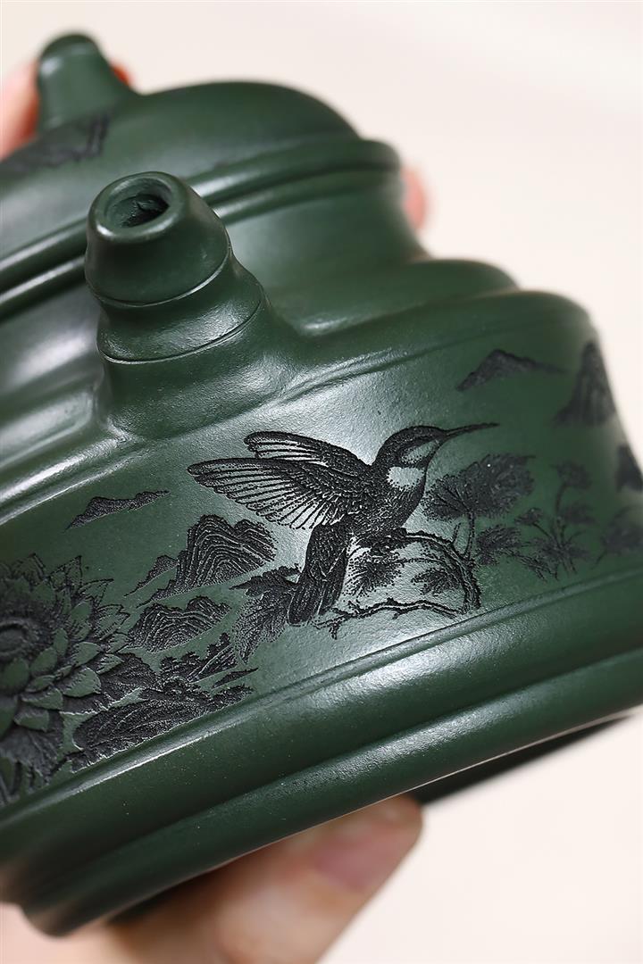 原礦綠泥刻繪花鳥竹鼎茶壺POT7569
