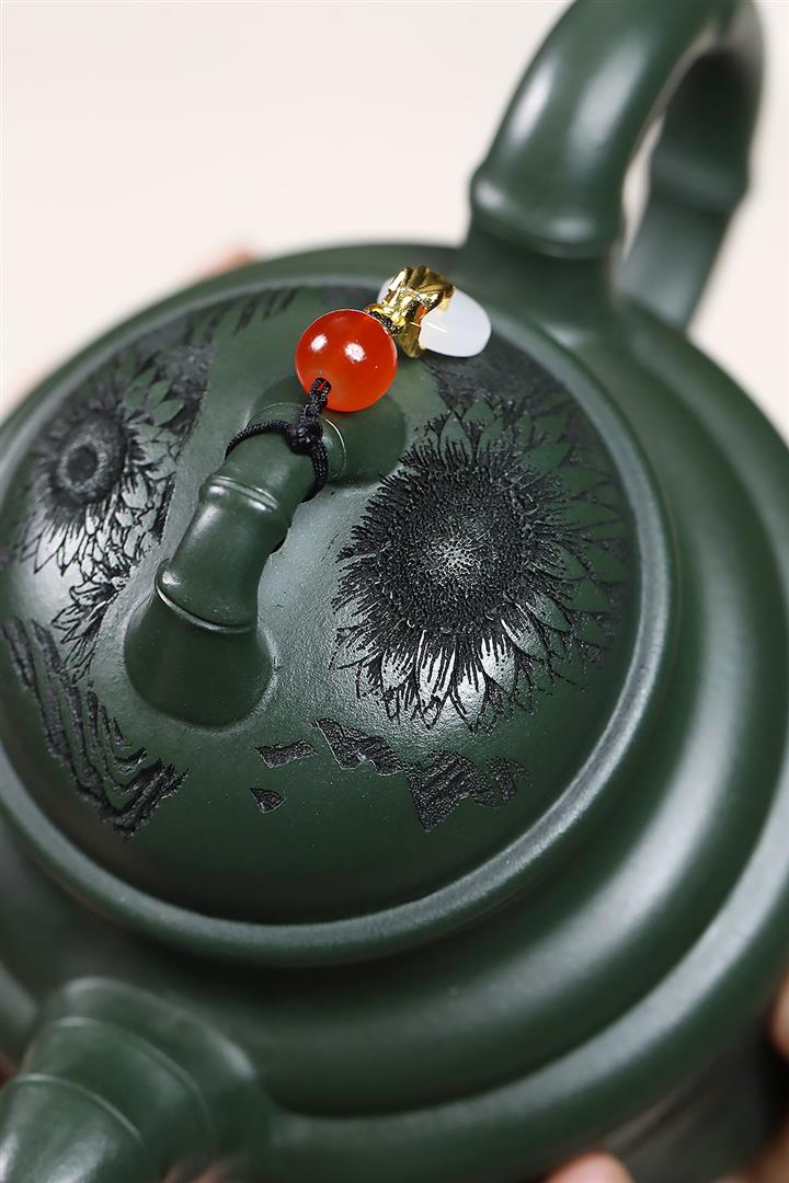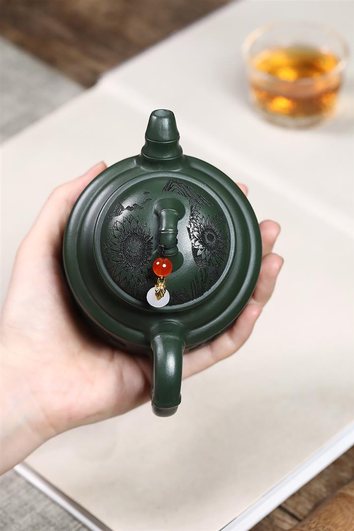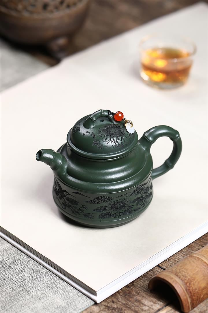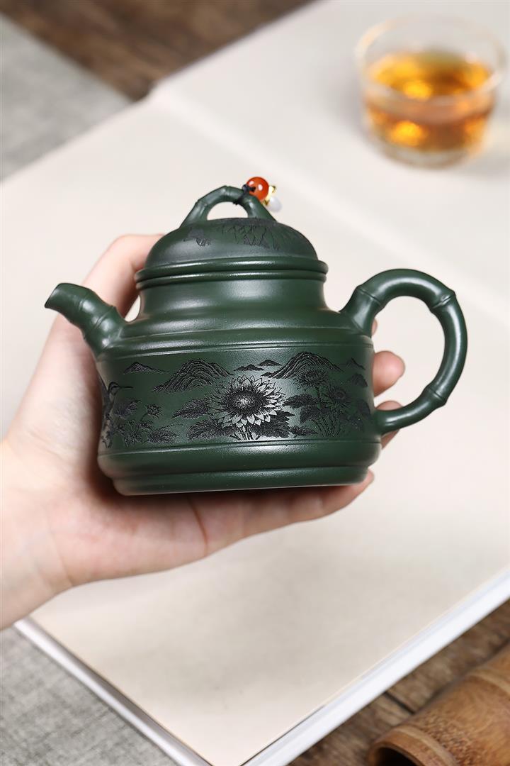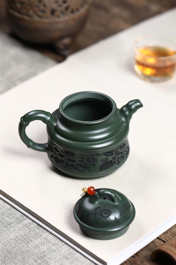 原礦綠泥刻繪花鳥竹鼎茶壺POT7569